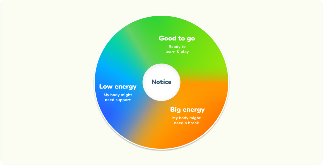 Kids learn to notice their energy levels — low, just right, or big — and understand what their body might need next.